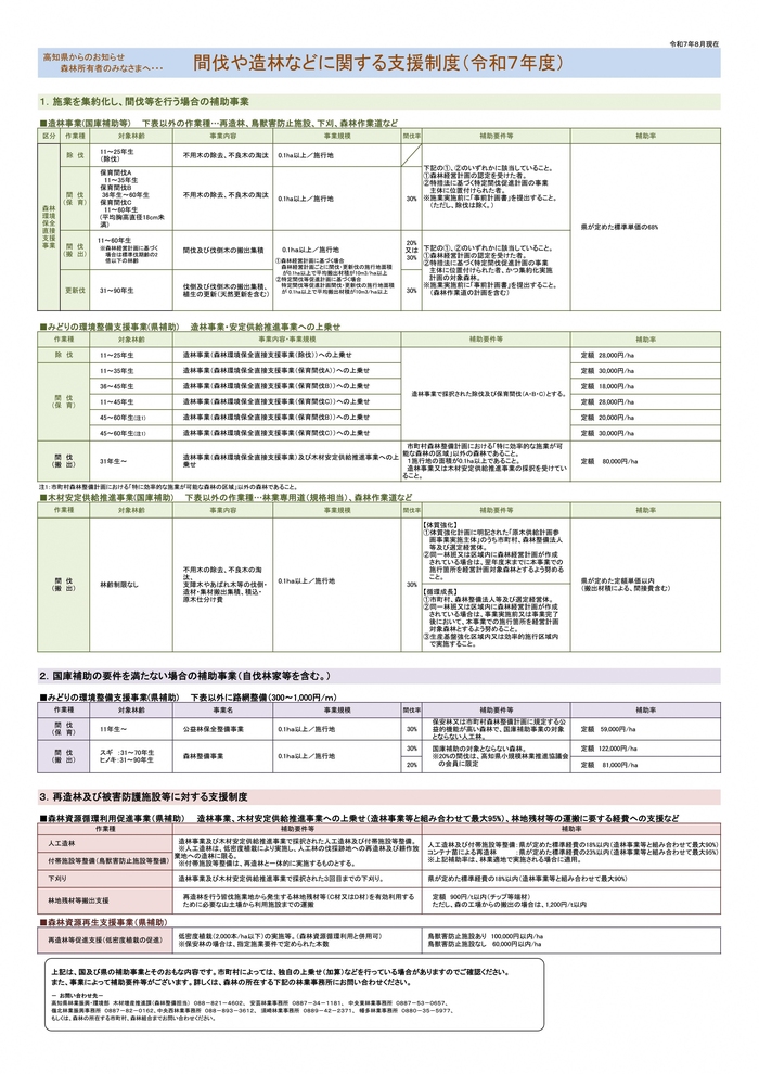 高知県では、森林が持つ多面的機能の向上と林業の振興を目的として、 間伐や造林の実施に対する各種支援制度(補助事業)を実施しています。 このたび、これらの支援制度を紹介するチラシを高知県が作成しましたので、 大川村ホームページにも掲載します。 ※なお、掲載事業のうち、すでに受付を終了している事業や 大川村では実施していない事業もあります。 ※詳しくは高知県嶺北林業事務所等までお問い合わせください。